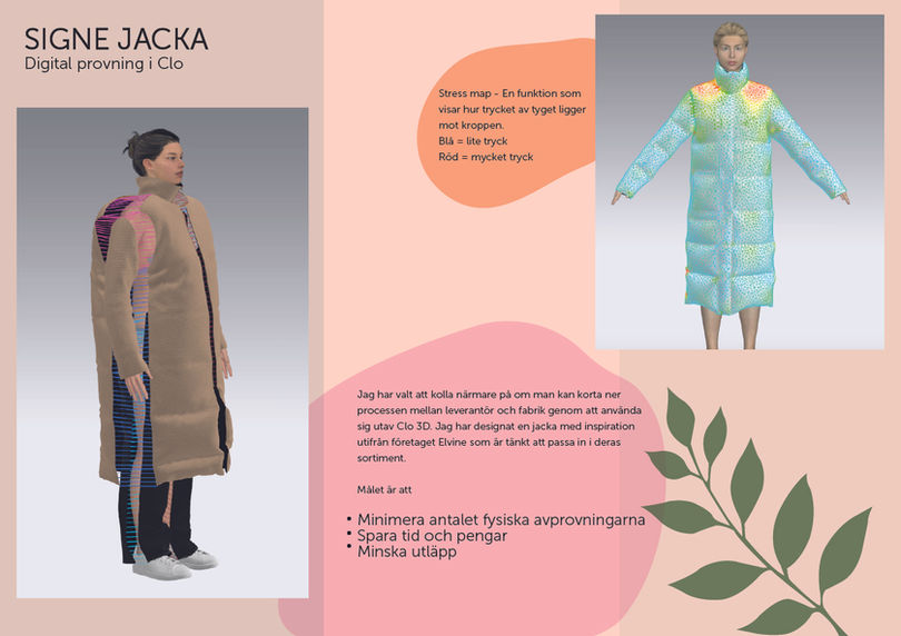 I det här projektet har jag konstruerat en vinterjacka. Istället för att sy upp en toile så gjorde jag flera avprovningar i Clo 3D innan jag sydde upp jackan. Därefter jämförde jag passformen på den simulerade jackan och den fysiska. Fungerar det verkligen att göra prototyper i 3D för att undvika uppsydda prover, och vad skulle det betyda för framtiden?