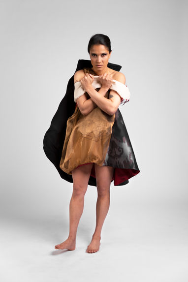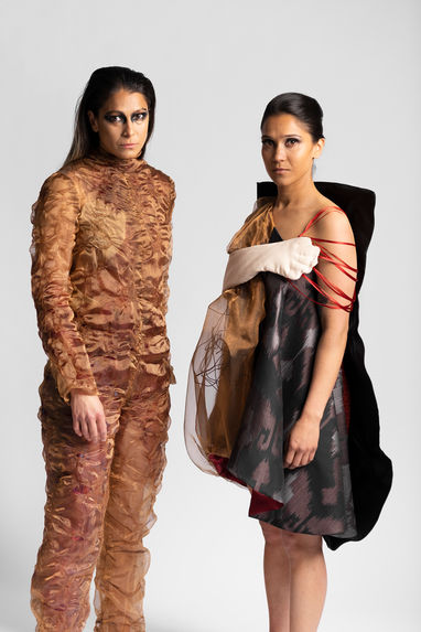 Jag har skapat två plagg. Byxdressen belyser fysiskt våld. Ett ojämnt och trasigt skinn med blåmärken över stora delar av kroppen. Klänningen belyser det psykiska våldet. Den mer eller mindre osynliga kampen som sker hos en kvinna som blir psykiskt misshandlad. Där hon försöker hålla upp en fin fasad om att allt är bra. Men inuti är det ett virrvarr av känslor och ifrågasättande av sig själv. En hand som tar det den kan. En slitning som blir större och större.