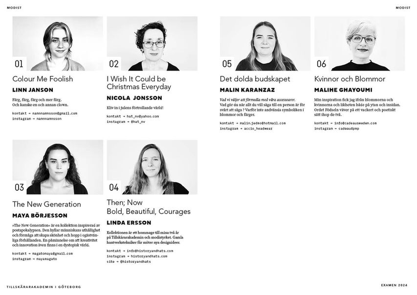 Nytt för i år är att catwalken har flyttats in till vår granne Forums härliga lokaler. Under visningen ser du ett tvärsnitt av skolans många discipliner: Mönsterkonstruktion och sömnad, Skrädderi – Herr- Dam och Klänning, Modist och Scenkostym och Historiska dräkter. En kavalkad av galaklänningar, vardagsplagg, avantgardistiska huvudbonader, klassisk skräddarkonst, historiska korsetter, kjolstommar och en och annan djurdräkt.